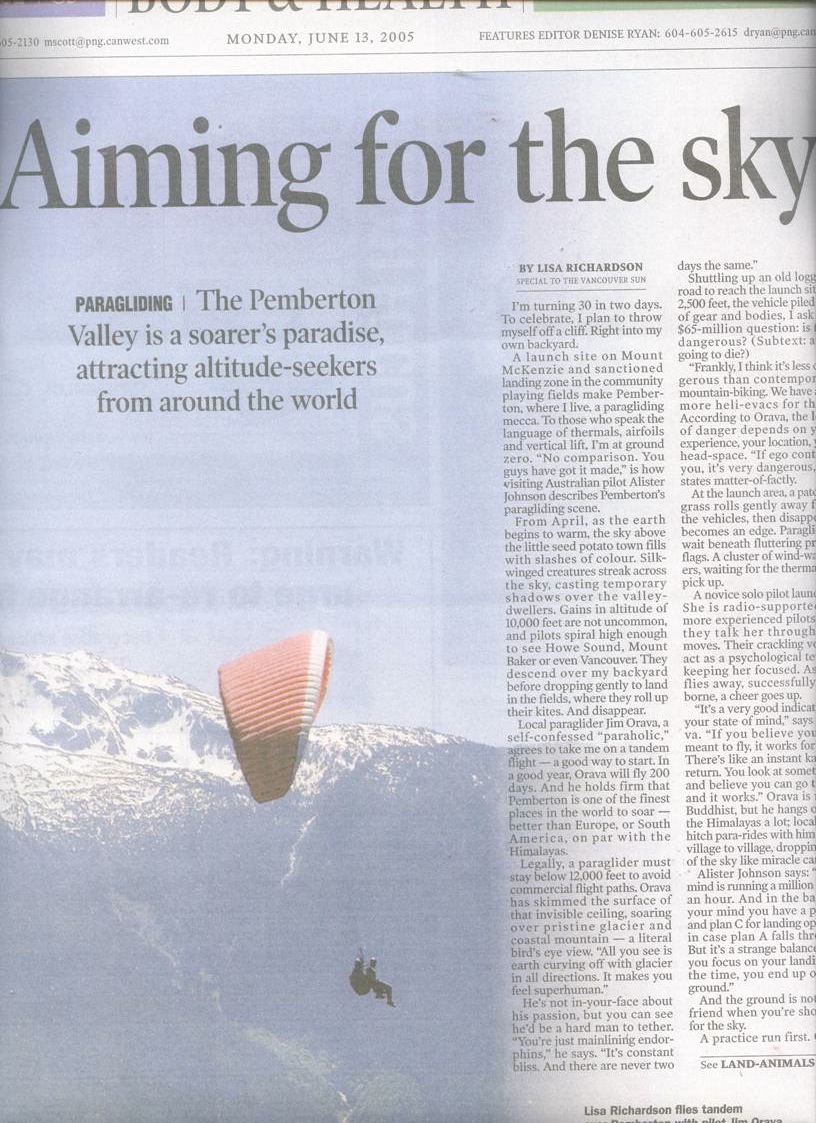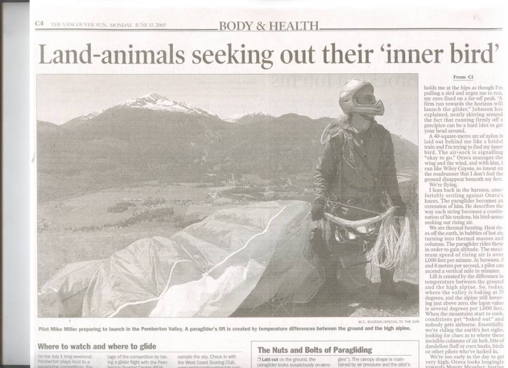 I was in good company – Pemberton paraglide guru, Jim Orava, was strapped to my back. Photographer MC Bourgie shared the thermals to my left, shooting so intently through her lens that she landed with a nasty bout of motion sickness. I wrote a story in the Vancouver Sun that ran a few days later.