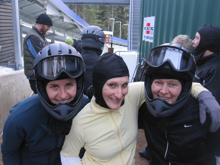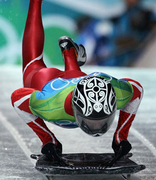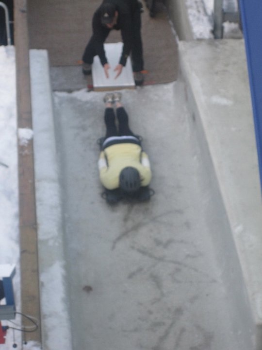 The public skeleton sliding program, which starts February 16 and runs until March 20, 2011, uses the bottom third of the Olympic track, so the steep (and controversial) start section is avoided. We slide through 6 corners, from just above corner 11, and though we will approach 100 km/hr and experience two and a half times our body weight in gravitational forces, we won’t come close to Montgomery’s 5 G-force, 146.6 km/hr gold medal-winning run.