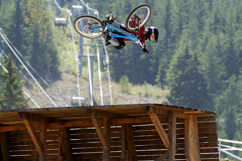 2001 Dave Watson wins the first Joyride, an event organised by the Whistler Summer Gravity Fest founders Paddy Kaye and Chris Winter, Whistler’s first biker cross: “Unlike most events that they would compete in, Joyride was more about just having fun and riding the unreal terrain in Whistler,” remembered Dave Watson. That fall, the Harvest Huckfest debuted, a jump demo that was the beginnings of Whistler’s slopestyle course. Kaye and Winter also produce the first Crud to Mud. Hosting Kranked movie-screenings and the MSP and TGR film premieres in Whistler helps them pay the bills to keep the events side of things afloat. In 2002, Joyride brings in international riders, including Cedric Gracia, Brian Lopes and Steve Peat, who fall in love with the park and spread the word, putting the Whistler Bike Park on the map. Lopes later says: “Whistler is hands down the best place to ride a bike. Riding there made me buy a house there, so it must be special.” In 2003, Gravity Fest includes the Joyride bikercross, an Air Downhill on A-Line, a 2 day trials event, and the first Slopestyle Expression Session, an X-gamesish freerie competition where riders are judged on creativity, type and number of tricks, smoothness, bike control and aggression.