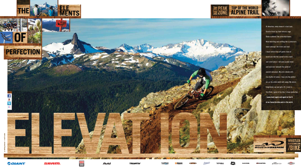 I was writing the copy for a series of ads for the Whistler Mountain Bike Park, that would pick up where last year’s Elements of Perfection campaign, written by Mike Berard and Origin Design and Communications creative director Danielle Kristmanson, left off.