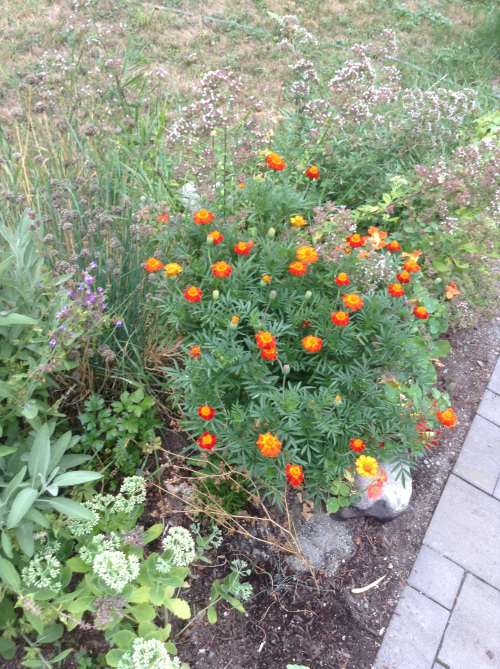 This May, at the Women’s Institute Plant Sale, I picked up one of Anna Helmer’s marigold starts. I have managed to keep it alive, despite the toddler’s attempts to eat it, deluge-water it, and dig it up, and it is now a monster of blooms and vigour – nothing like the tragic little marigolds one picks up from any major Canadian retailer to protect the lettuce from slugs. (Note: most of those plants have been treated with neonicotinoids, a systemic insecticide that renders them fatal to bees and other pollinators. Resume foetal position.)