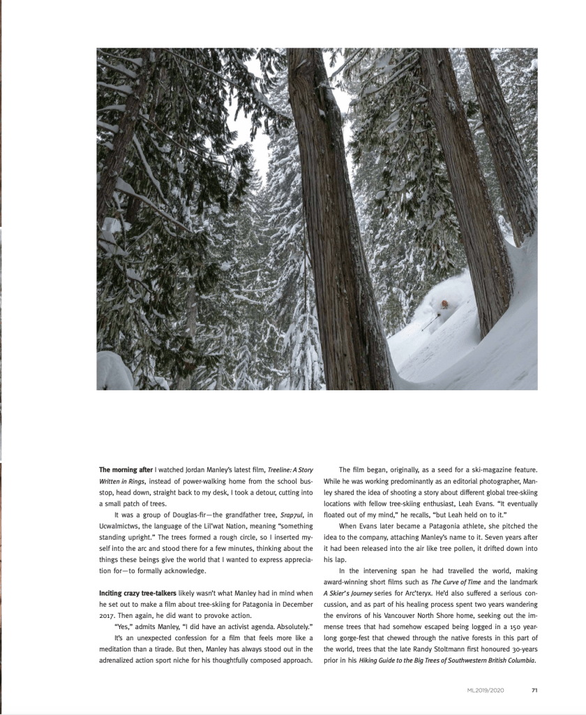 Inciting crazy tree-talkers likely wasn’t what Manley had in mind when he set out to make a film about tree-skiing for Patagonia in December 2017. Then again, he did want to provoke action.