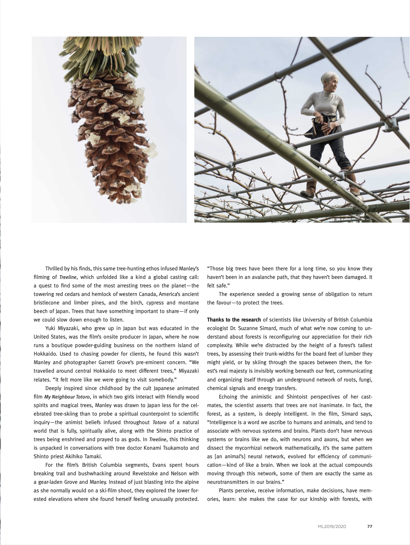 Deeply inspired since childhood by the cult Japanese animated film My Neighbour Totoro, in which two girls interact with friendly wood spirits and magical trees, Manley was drawn to Japan less for the celebrated tree-skiing than to probe a spiritual counterpoint to scientific inquiry – the animist beliefs infused throughout Totoro of a natural world that is fully, spiritually alive, along with the Shinto practice of trees being enshrined and prayed to as gods. In Treeline, this thinking is unpacked in conversations with tree doctor Konami Tsukamoto and Shinto priest Akihiko Tamaki.