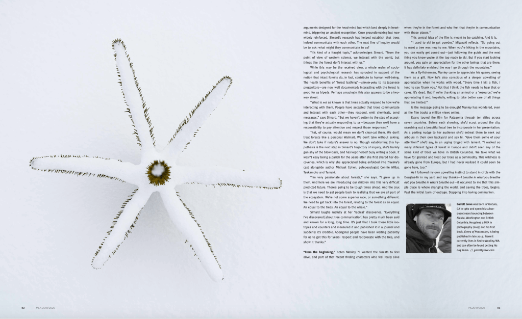 Featuring the photography of Garrett Grove, commissioned by genius editor Leslie Anthony, and inspired by Jordan Manley’s film Treeline, this story signifies the beginning of a complete shift in my relationship with trees. Yep. This – Jordan’s film and Dr Simard’s work, is what started my morning conversations with a circle of Douglas Fir at the front of my home, that continues to this day.