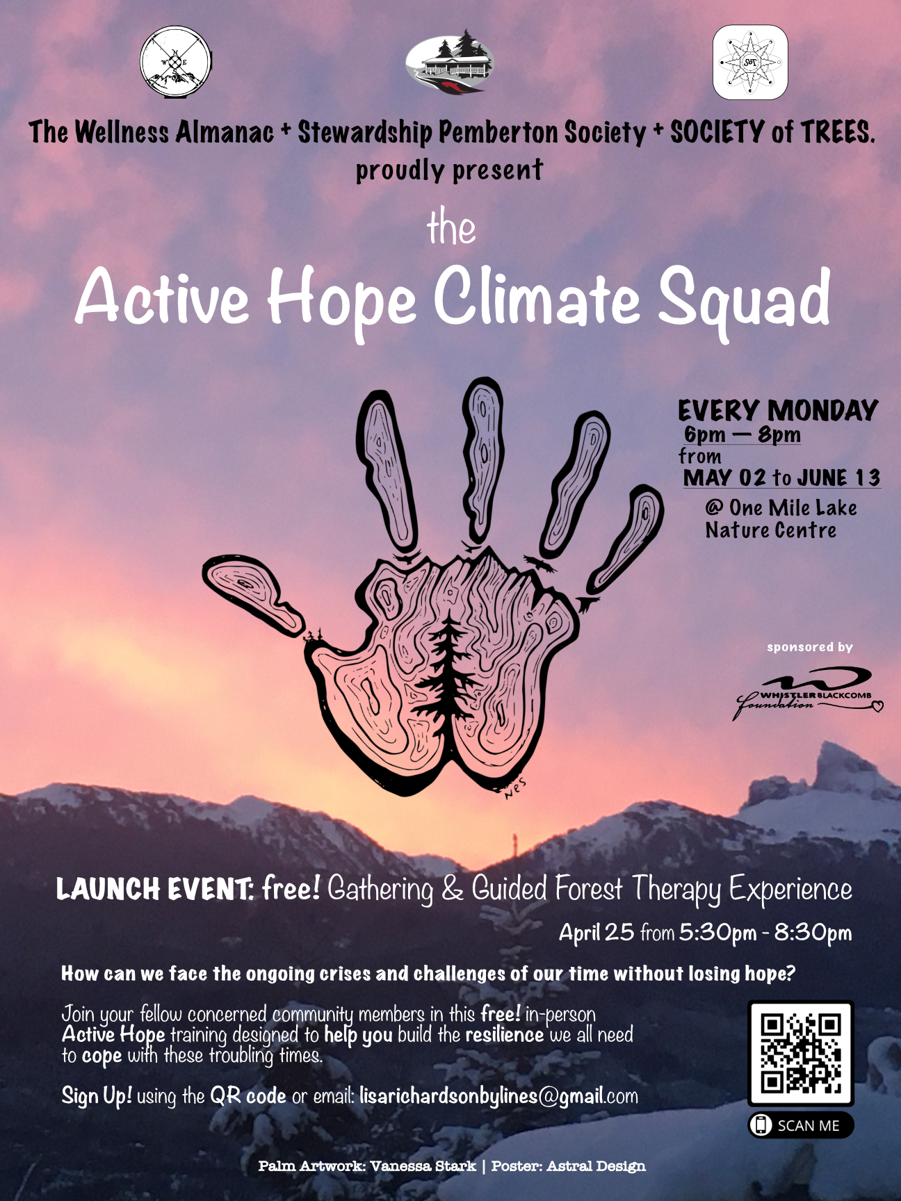 With the support of Stewardship Pemberton, The Society of Trees, the Wellness Almanac and the Whistler Blackcomb Foundation, we’re collaborating to host an 8 week long social club, The Active Hope Climate Squad, kicking off on Monday April 25, with a free guided forest bathing experience, led by Monica Sander Burns of the Society of Trees. We’ll meet Monday evenings at the One Mile Lake Nature Centre until June 13 with the idea that when facing any kind of crisis, but especially a planetary one, it’s best not to go it alone.