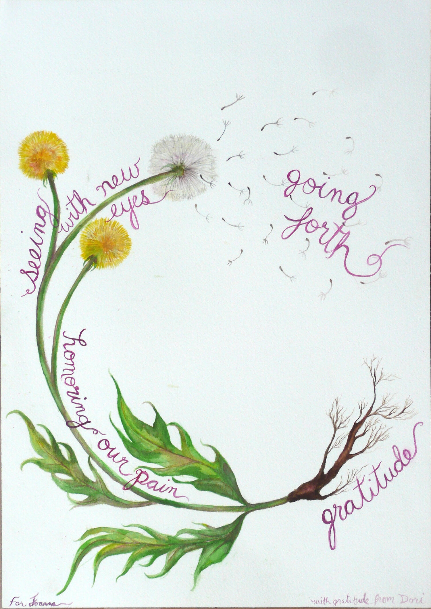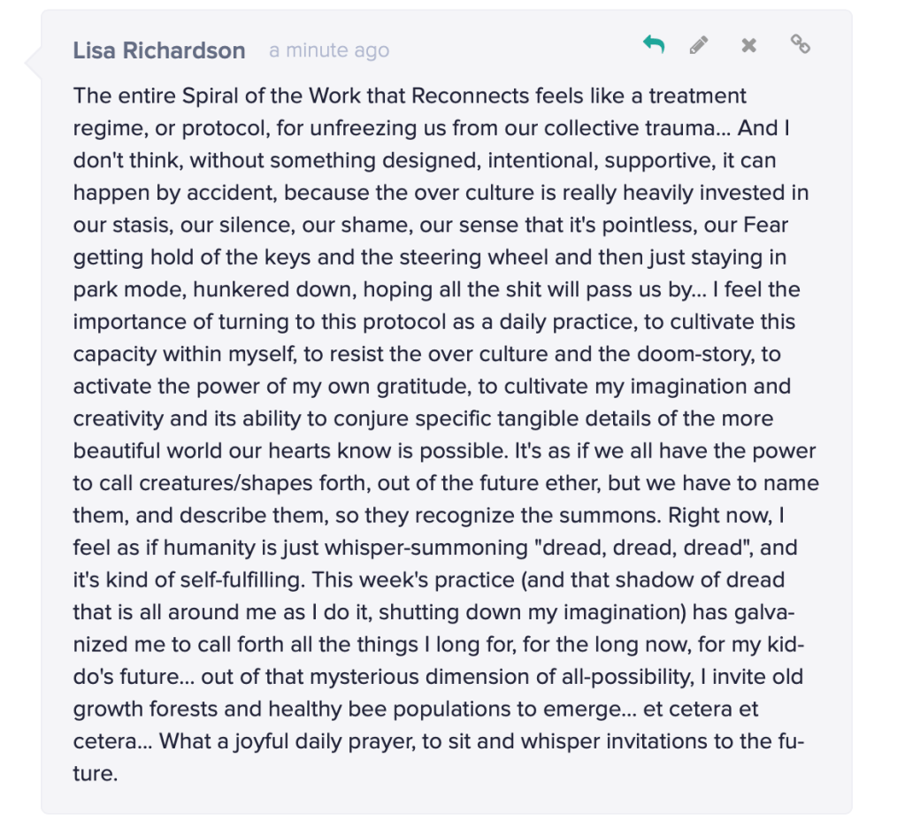 We took a virtual pilgrimage together – travelling the Spiral of the Work that Reconnects – starting in gratitude as a grounding place, a way to resource ourselves, and then turning to face our pain for the world and honouring it as our recognition that something is out of whack… and then, to see with new eyes by understanding everything as a system which empowers us to be small and to effect change… and to ask, what is mine to do and to go forth with some small intervention you’re going to offer.