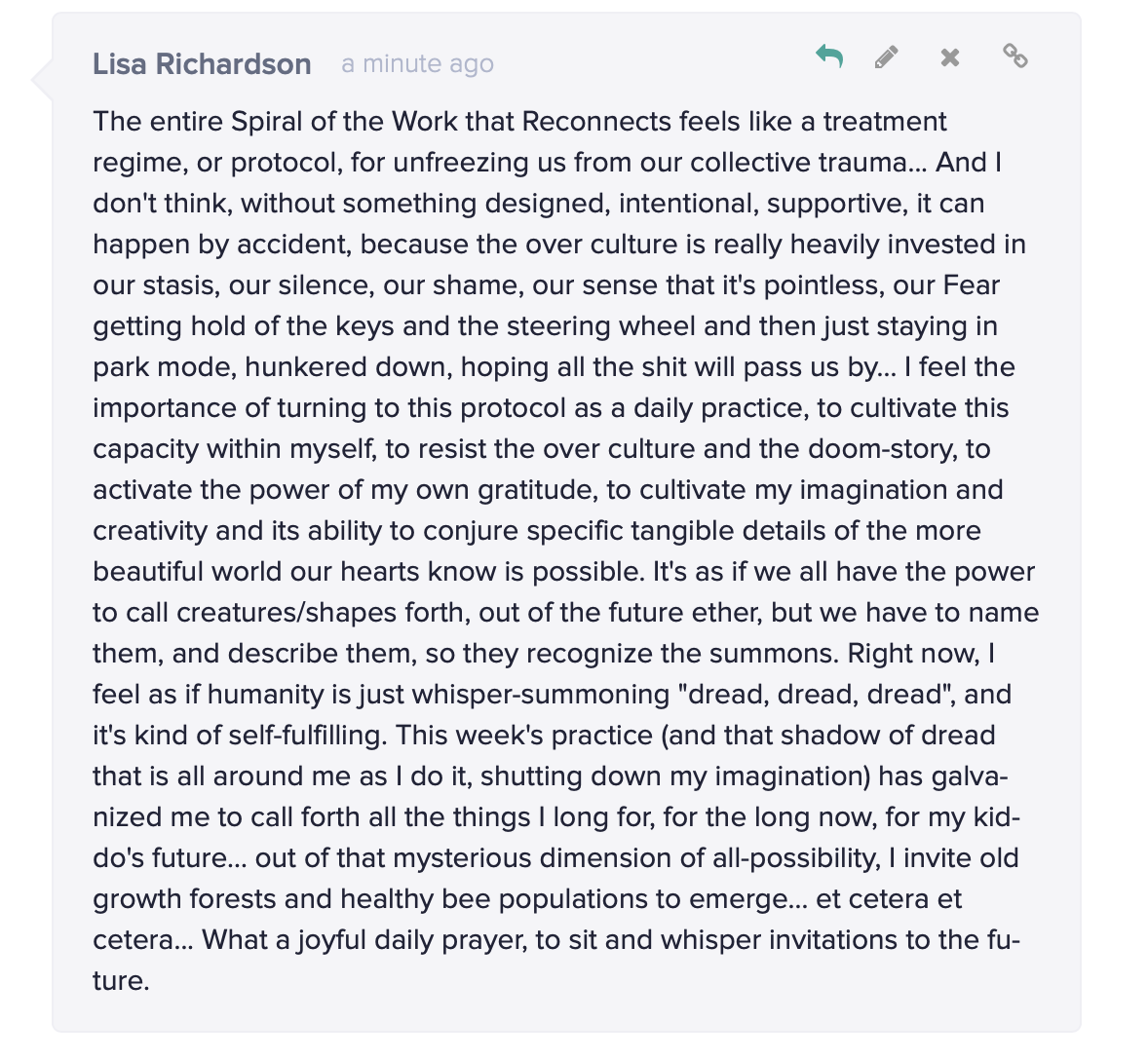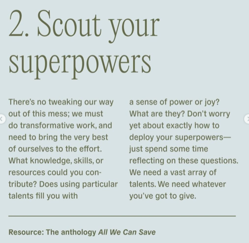 The course content required about an hour a week and, in combination with weekly meetings with my Active Hope buddies in New Zealand, Portugal, Germany, Scotland, and England/The Netherlands, (that required me to log in at 5am PST), was incredibly resourcing during a time when the IPCC was dropping its first report, COVID was very much at large, and the world seemed to be on a collision course with self-destruction.