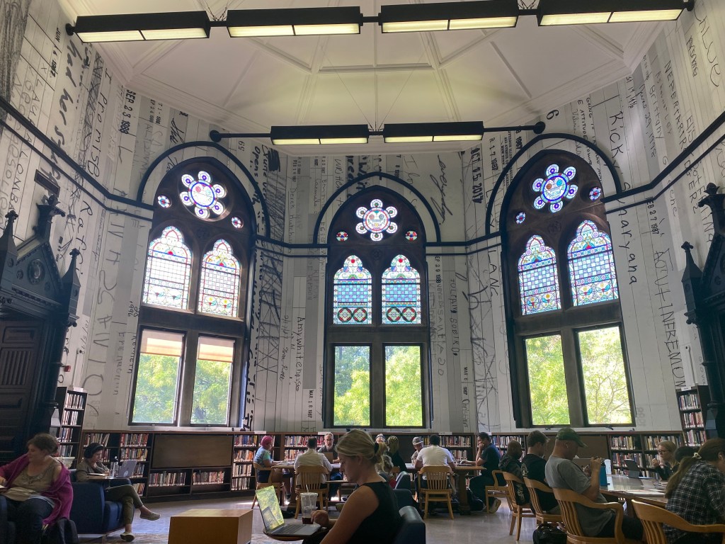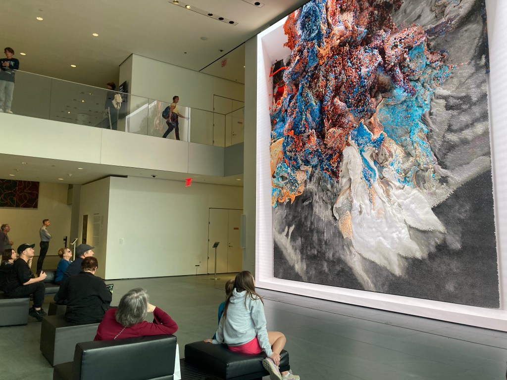 At MOMA, I do the thing with art that Oliver Burkeman made famous in his book 4000 Weeks: just sit in front of one piece of work, for an hour or more. It will transform you more than racing through the museum trying to check off every exhibit. Maybe it was cheating to pick a piece that’s alive. Refik Anadol’s installation, Unsupervised, is hailed as the first AI-generated art, an intelligent machine digesting, regurgitating, interpreting, the Museum’s 200 year-rich collection. The 24 by 24 foot screen dominates the lobby mesmerising crowds who are universally compelled to film pieces of the piece on their phones, crowding the cloud with replicants of this AI-generated phenomena where presumably future AI will spit out cultural offerings made up of these images of images of images.