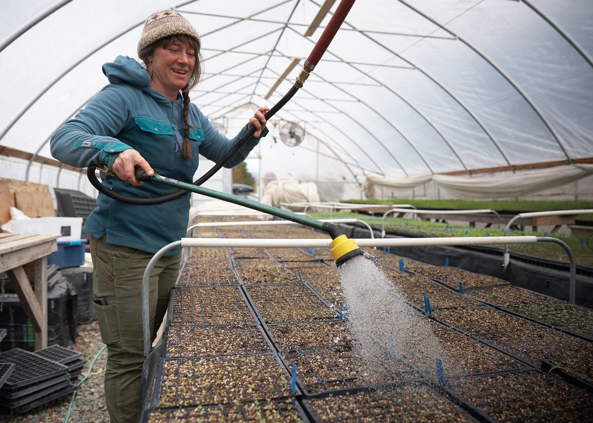 After watering the baby tomatoes in the nursery, McCann brushes her hands gently over them, shooing the water off, helping strengthen their stems. She’s preparing them for the transition out of greenhouse, so they will be able to stand strong when the first wind comes along.