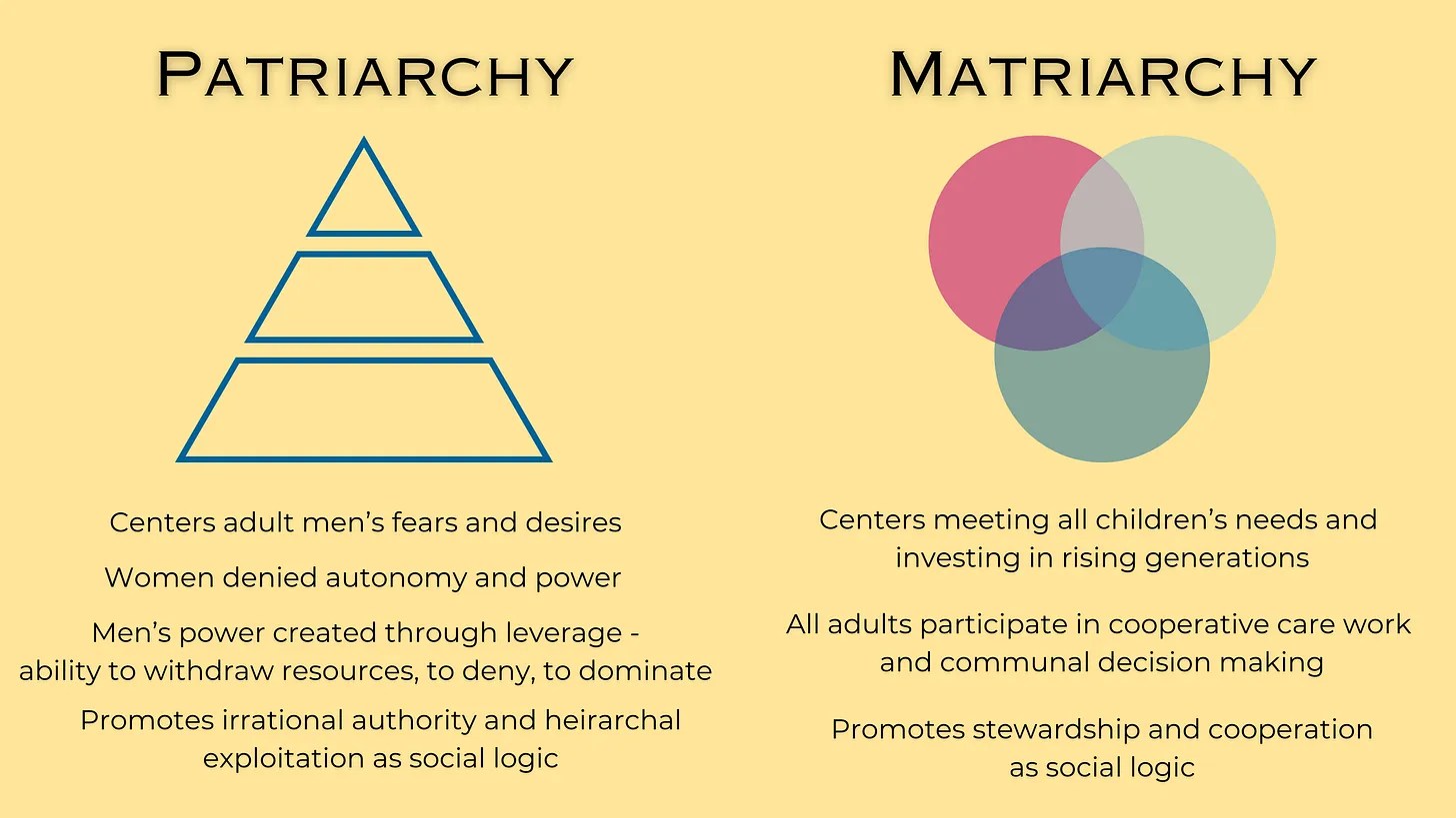 The opposite system to patriarchy, in my mind, is one that could be called a matriarchy, but it isn’t about men and women or mothers and fathers, so the words themselves can be a stumbling block but essentially it’s a system that is entirely different to a system that centres power and control and domination. It’s simply about centring care. It’s the idea of a system that honours, uplifts and centres care, as the central thing that makes life flourish. In this other system, the kind of tending and attending that we all need and crave, that the Earth needs, that life-affirming “growth” needs (as opposed to extractive “economic growth”), is respected and supported and valued, and reciprocated, and nurtured, and fed. We would prioritize everything that supports and enhances care.