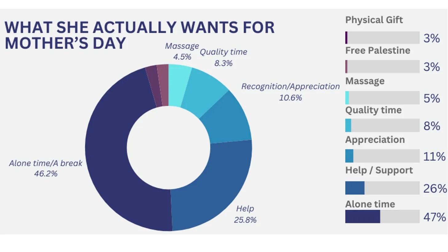 I’d just shown my partner a substack from one of my favourite writers on the patriarchy, Celeste Davis, (https://celestemdavis.substack.com/p/not-believing-women ), which may be why the Insomnia Fairy had plucked this particular concern out of my restless brain for me to obsess over. Davis had shared a graph of the things mothers wanted most for Mothers Day. My laugh, when I showed it to my partner, was so raucous and unhinged, that he took a few steps backward, assessing the threat level of the situation. In the graph, 3% of women wanted a physical gift, which was just as many as wanted a Free Palestine for Mother’s Day. What women wanted, all 47% of them in fact, was alone time.