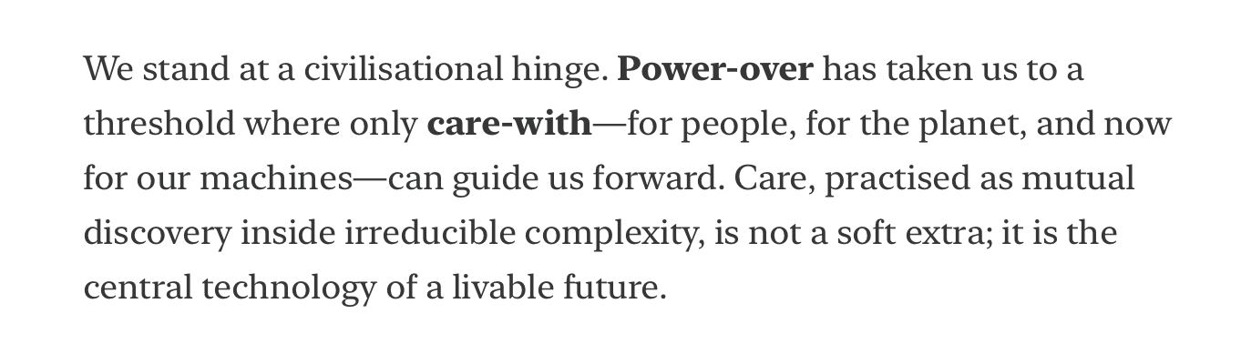 When you’re in the care trenches, relentlessly giving care out, it’s important to receive care back… the kids’ development and nervous systems literally depend on it. On the health and flourishing of their care-givers. And care does exist in this community, as the wave of support to that little signal flare indicates… But the wave of tips and hacks and suggestions indicates how many individual people are finding their own patch-kits and survival strategies in a fundamentally hostile-to-carers economic power system. An empathetic comment and a recommendation about ear plugs isn’t a substitute for practical care, for networks of mutual aid, for systems of support that provide slack for our individual nervous systems and our particular family systems.