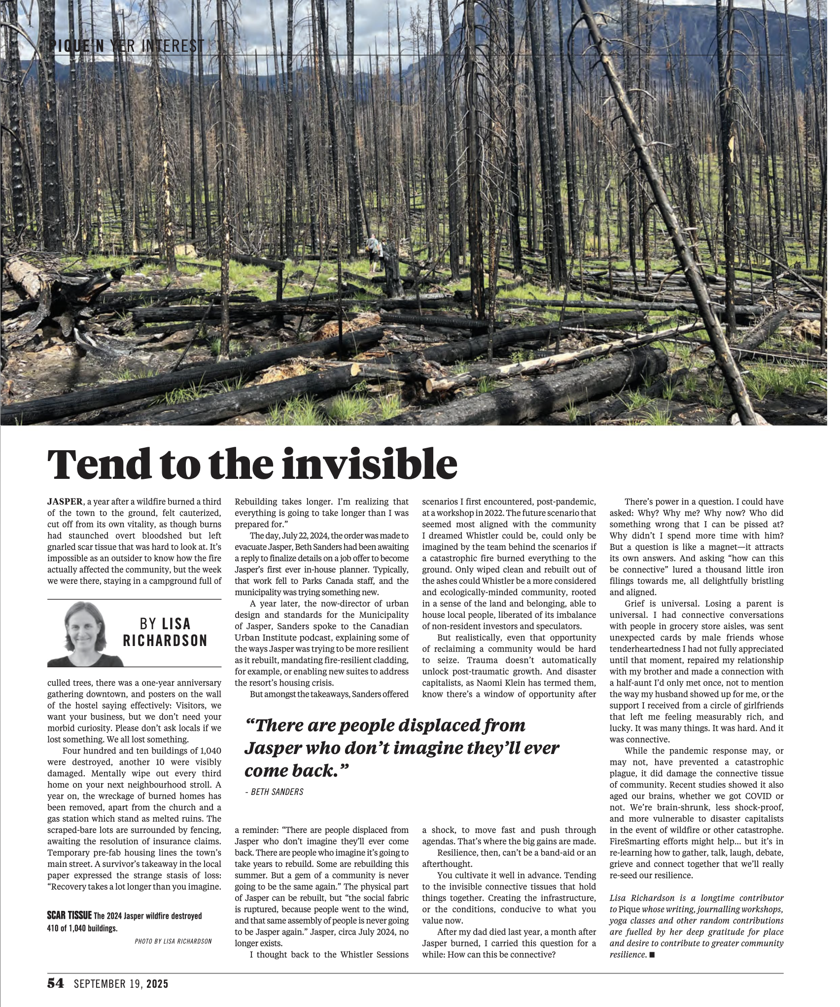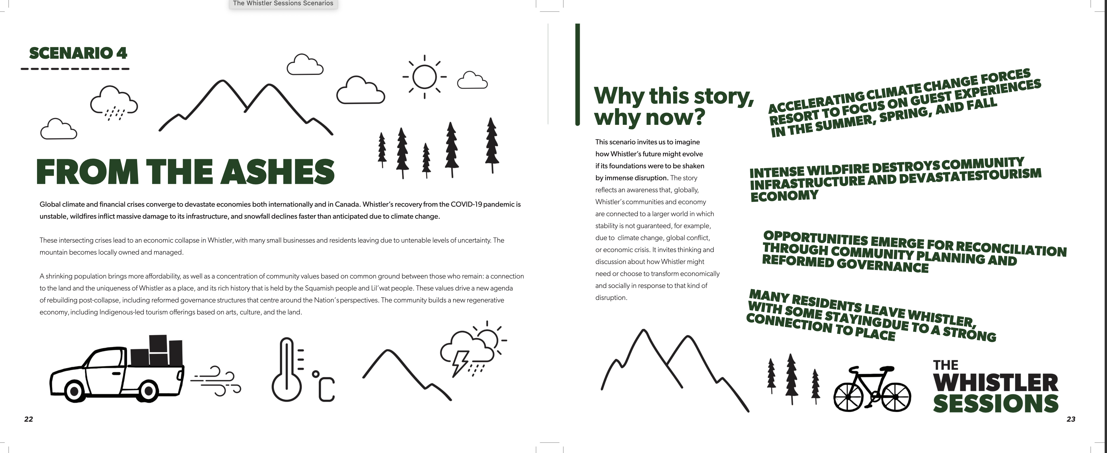 I thought back to the Whistler Sessions scenarios that I’d first encountered, post-pandemic, at a workshop in 2022. The future scenario that seemed most aligned with the community that I dreamed Whistler could be, could only be imagined by the team behind the scenarios if a catastrophic fire burned everything to the ground. Only wiped clean and rebuilt out of the ashes could Whistler be a more considered and ecologically-minded community, rooted in a sense of the land and belonging, able to house local people, liberated of its imbalance of non-resident investors and speculators.
