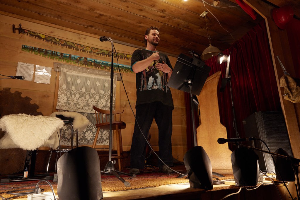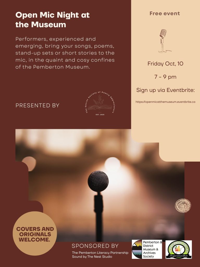 Before we knew what was happening, fifty people had registered online and suddenly people were getting a “sold out” message on our eventbrite listing. Undeterred by this roadblock, a stalwart mysterious poetry appreciator named Saadia messaged the Museum asking how she could get in, and Charmaine dutifully forwarded the request to us. How on Earth a tourist visiting Pemberton had heard of our little grassroots made-up thing was another mystery, but Jay emailed her a welcome, and HERE’S THE POINT OF THE STORY, a week after the Open Mic actually happened, blowing all our minds with the generosity and talent of the audience and participants, Saadia emailed us to say “thank you for such a warm welcome. We were in Pemberton as a family on our first trip away from home, after my husband died in January, at just 58 years old. He was the most wonderful kind human and we are heartbroken. The love and support from family and friends is helping us to carry on, but there is something about the kindness of strangers that is particularly touching.” She referenced poems and songs shared during the Open Mic that spoke directly, unexpectedly, to them. “I assume we were not the only ones who were moved to tears. My husband would have loved the evening. It seems we were exactly where we were supposed to be.”